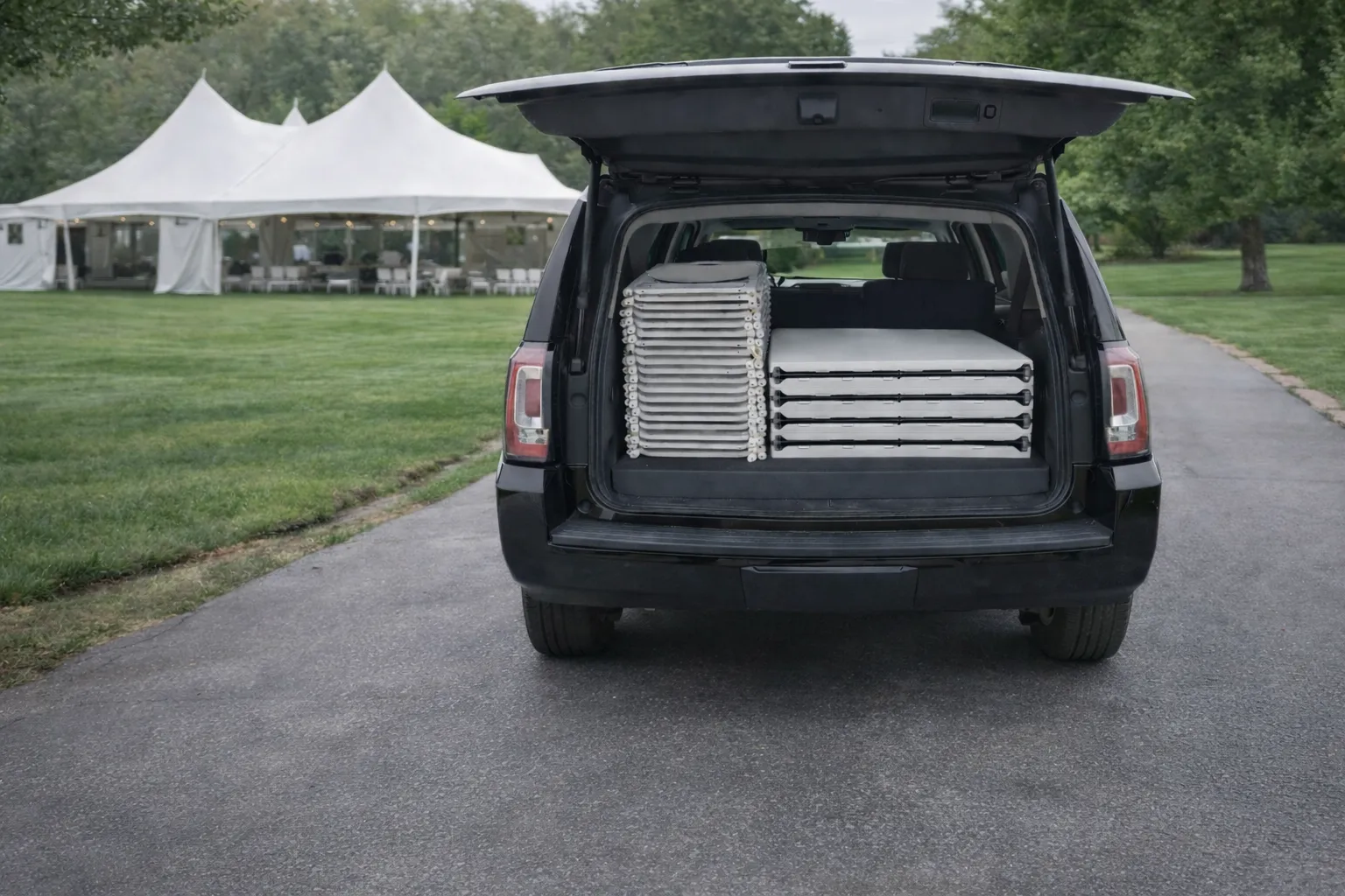 Chairs stack neatly, and most vehicles can accommodate 4 six-foot tables and up to 24 chairs. If you’re unsure about fit, just ask.